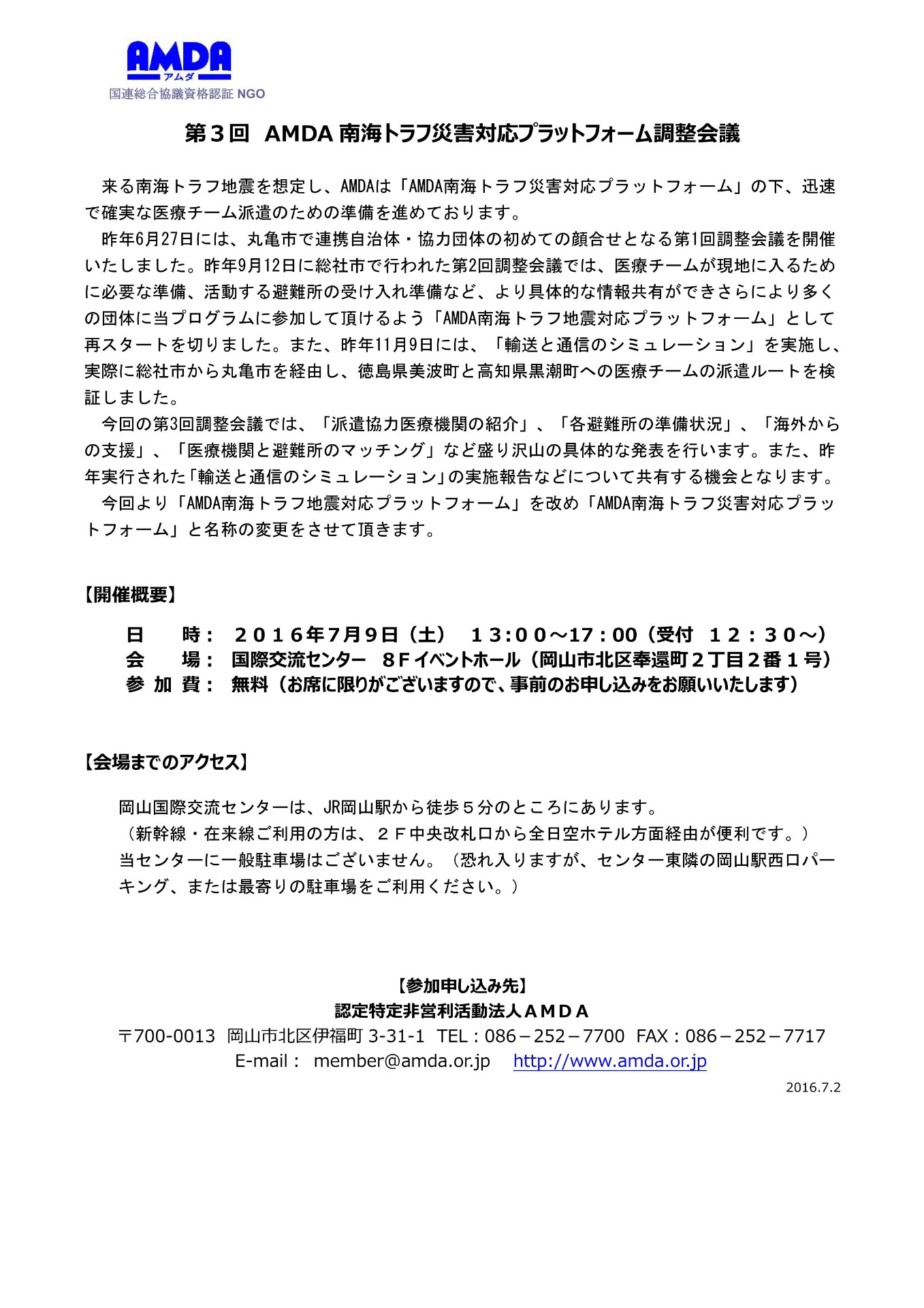2016年7月9日、AMDAは南海トラフ災害に備えた第3回調整会議を岡山市北区の岡山国際交流センターで開き、岡山、香川、徳島、高知の14自治体はじめ全国の医療・教育機関、海外のNGOなど約70団体約270人が具体的な対応策を協議しました。