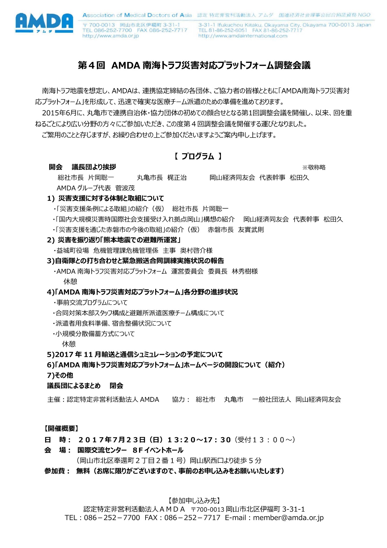2017年7月23日、第4回目となるAMDA南海トラフ災害対応プラットフォーム調整会議が、岡山市の岡山国際交流センターを会場にして開催されました。
